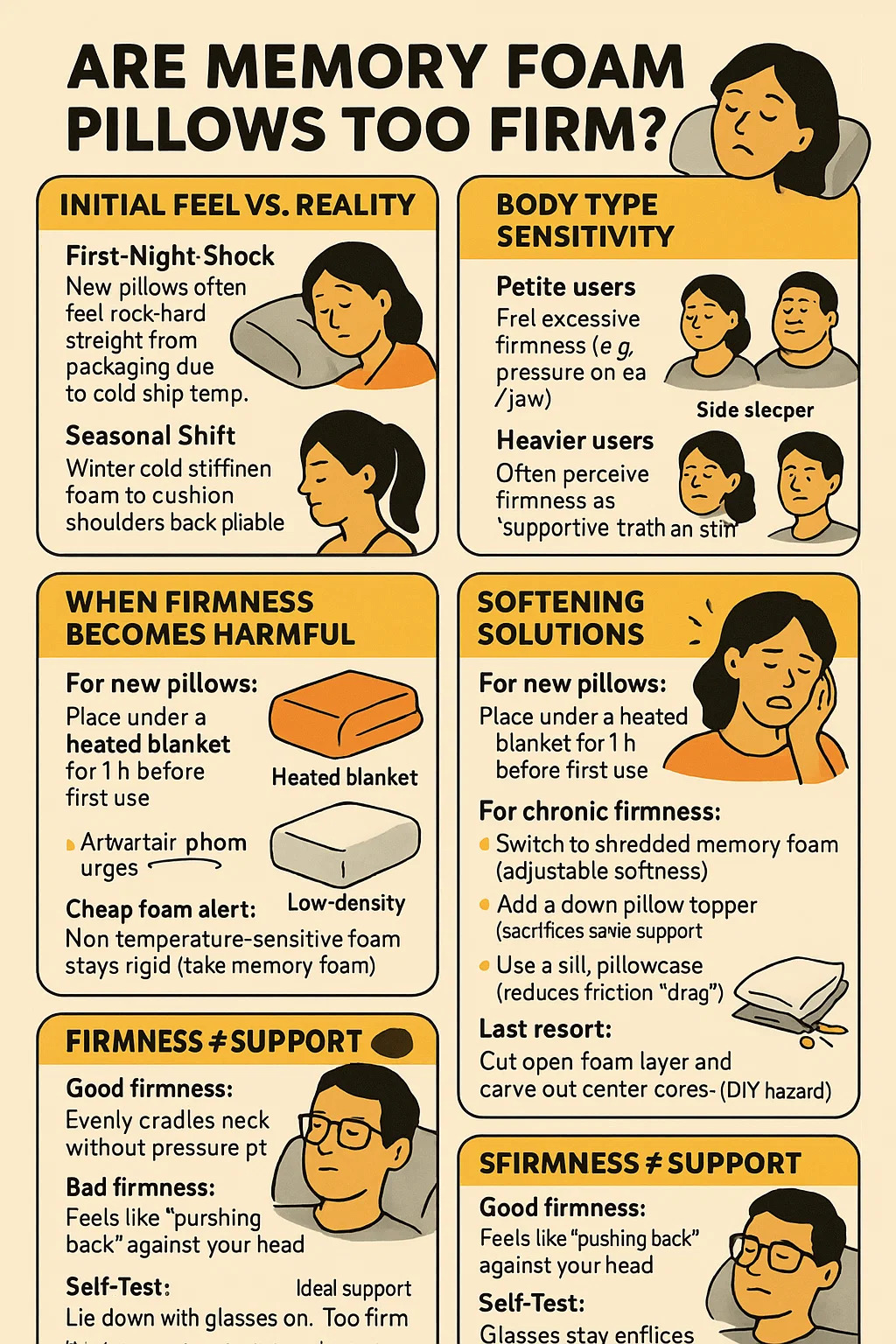 Pour une fermeté chronique : → Passez à la mousse à mémoire de forme déchiquetée (douceur réglable). → Ajoutez un surmatelas en duvet (sacrifie un peu de soutien). → Utiliser une taie d'oreiller en soie (réduit les frottements "traînée").