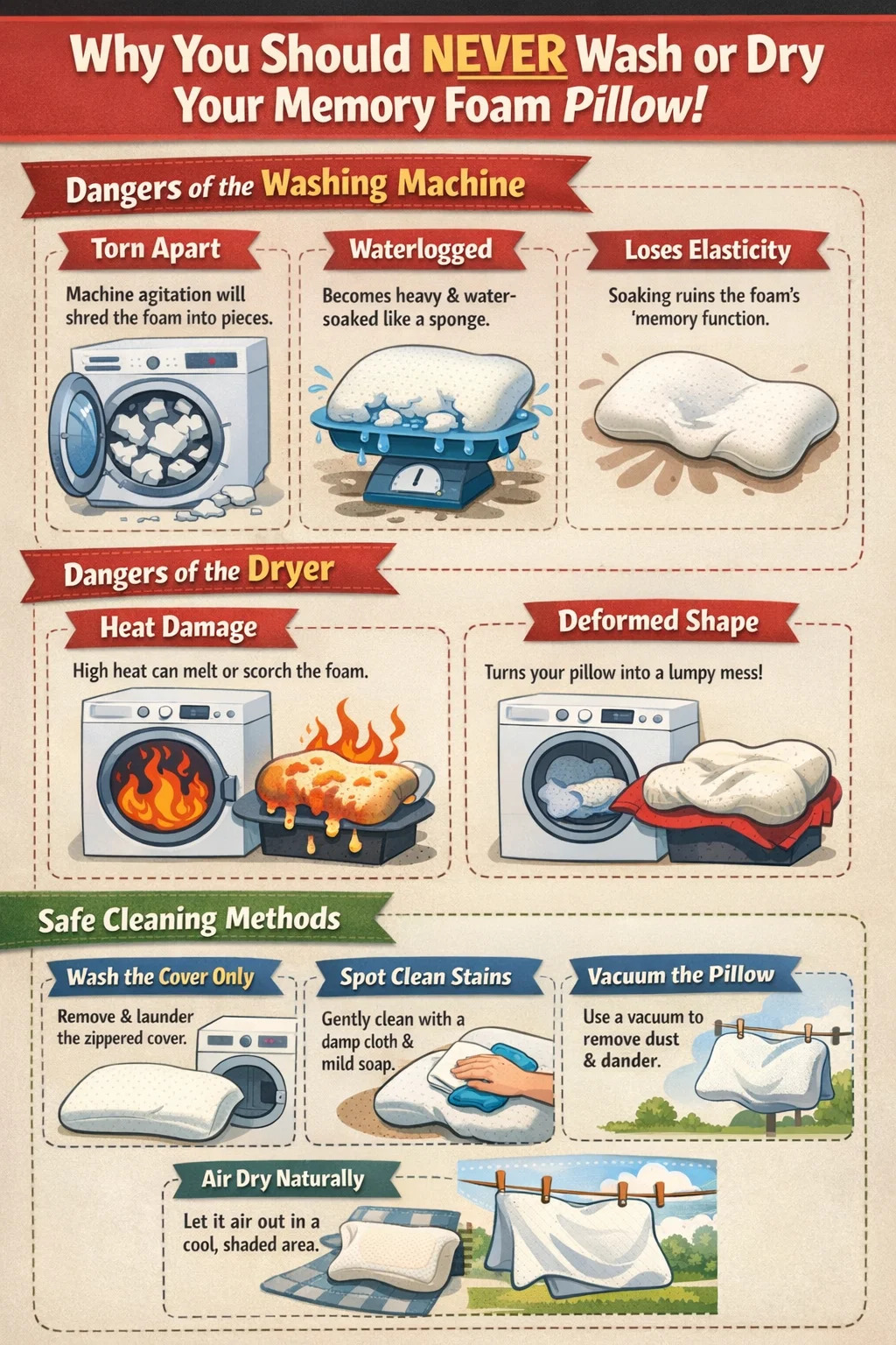 La réponse directe est : ne faites absolument pas cela ! En jetant votre oreiller en mousse à mémoire de forme directement dans la machine à laver et le sèche-linge peut sembler facile et hygiénique, cette action « assassine » pratiquement votre oreiller. Voici pourquoi vous devriez absolument éviter ces deux machines, ainsi que certaines méthodes de nettoyage plus fiables :