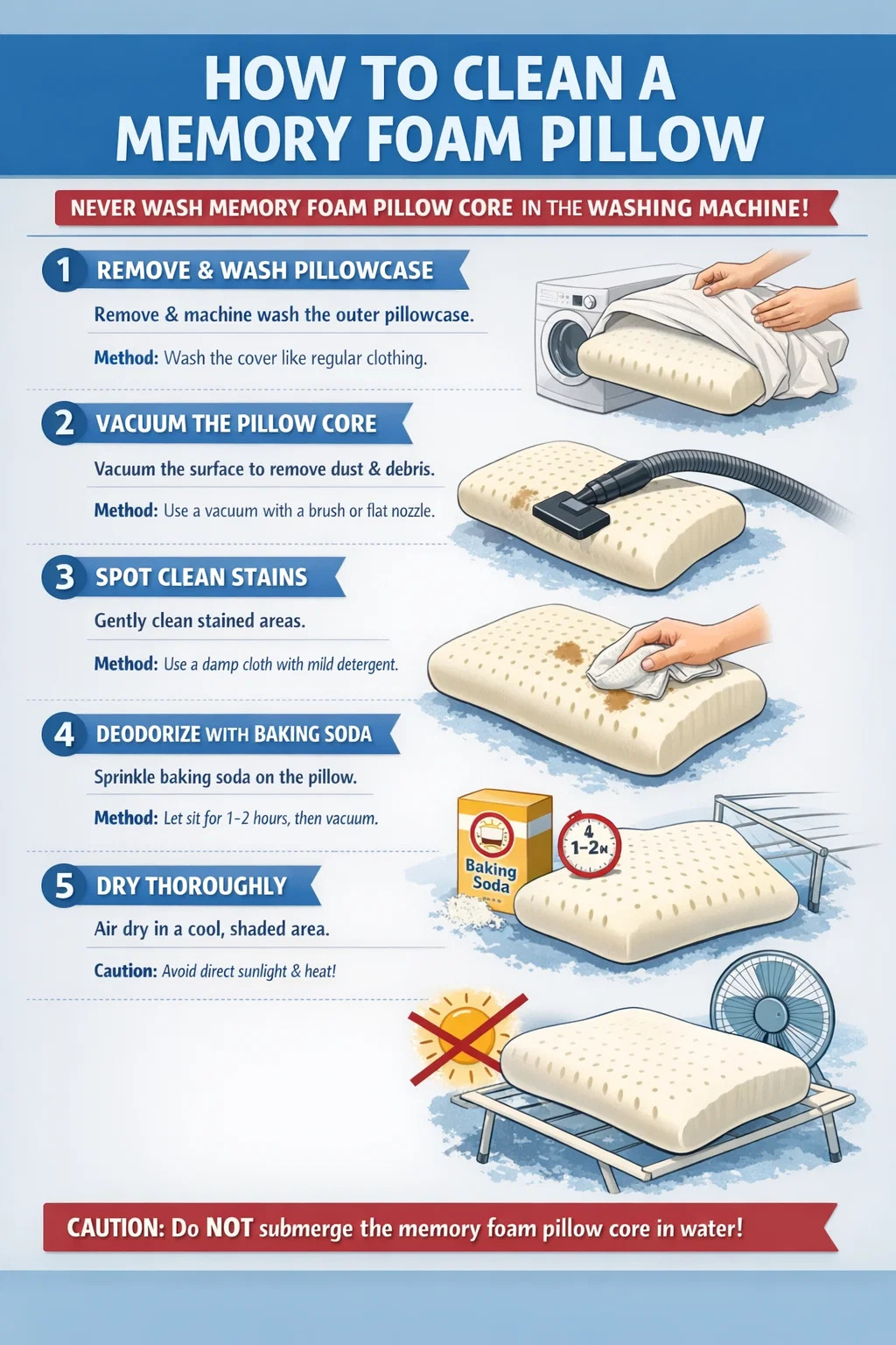 Bien que le « noyau de l'oreiller » ne puisse pas être lavé en machine, vous pouvez nettoyer votre oreiller en mousse à mémoire de forme en toute sécurité en suivant les étapes suivantes :