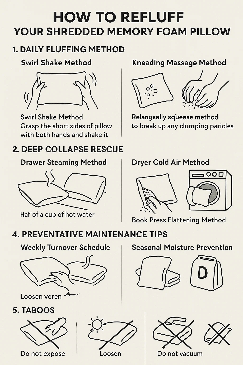 Méthode de vapeur du tiroir: Posez l'oreiller à plat dans un tiroir avec une demi-tasse d'eau chaude à proximité. Fermez bien le tiroir et utilisez la vapeur humide pour ramollir toutes les particules agglales. (Retirer et secouer après 20 minutes.)