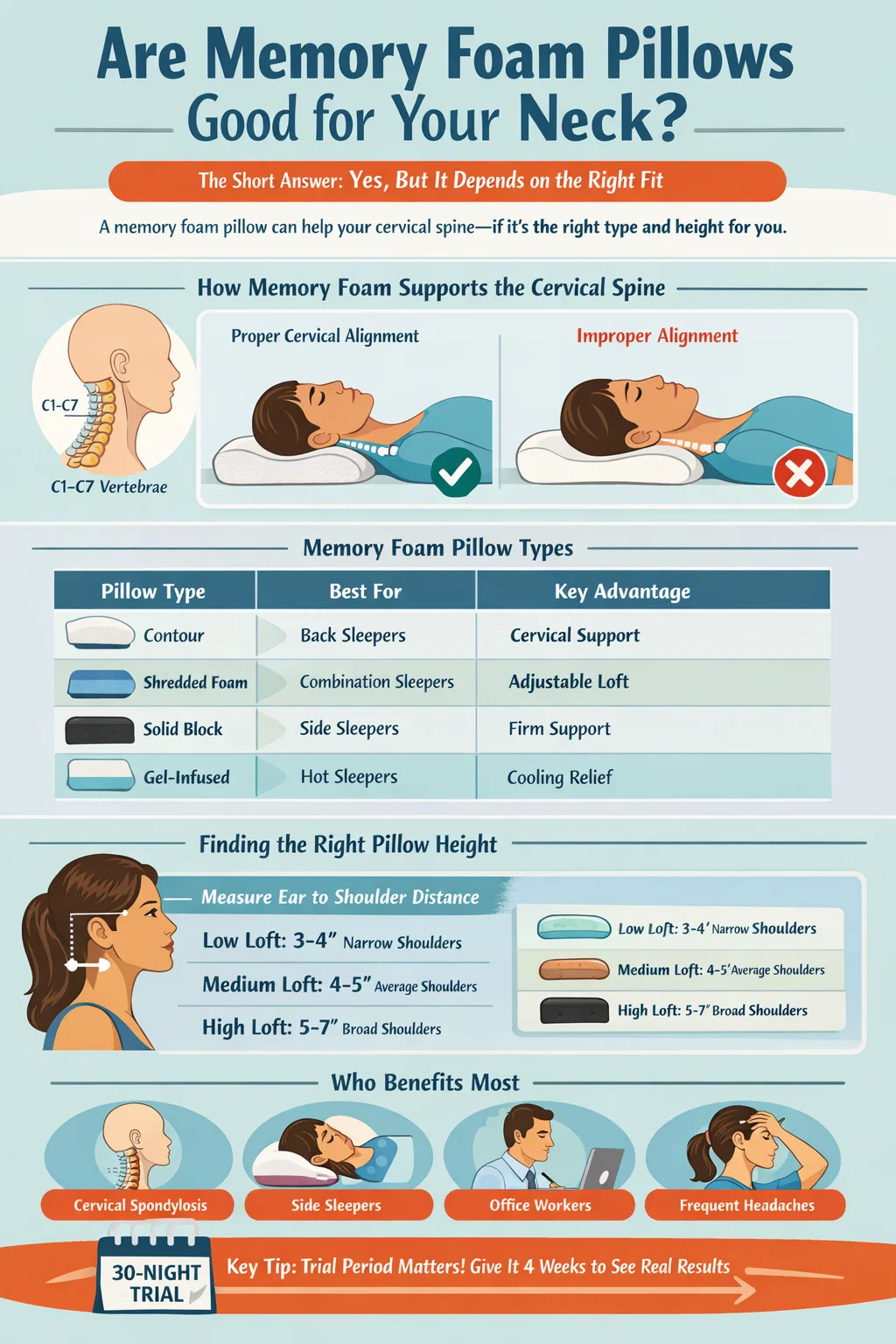 Choisissez un oreiller en mousse à mémoire de forme adapté à votre position de sommeil et à la largeur de vos épaules, faites-en un véritable essai de 4 semaines et évaluez honnêtement les résultats. Pour de nombreuses personnes, ce seul changement produit une amélioration mesurable et durable de la santé cervicale et de la qualité globale du sommeil.