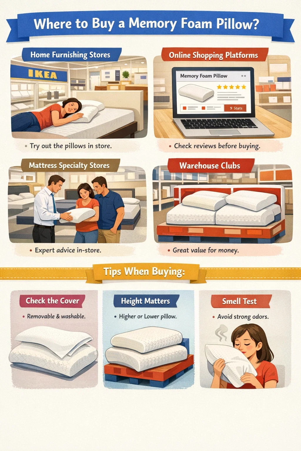 Des endroits comme IKEA ou des magasins spécialisés dans l'ameublement sont le premier choix de nombreuses personnes lorsqu'elles choisissent un oreiller en mousse à mémoire de forme.